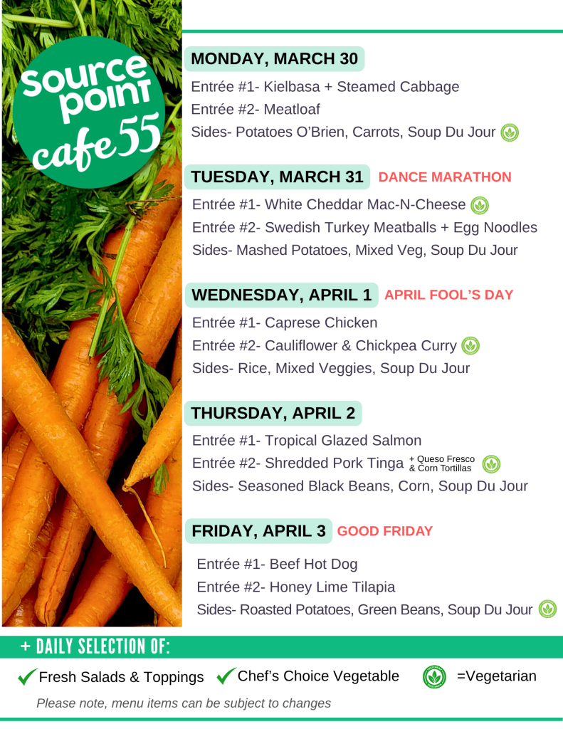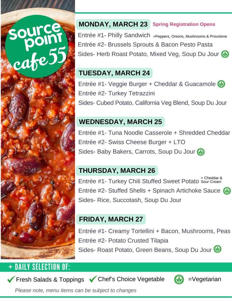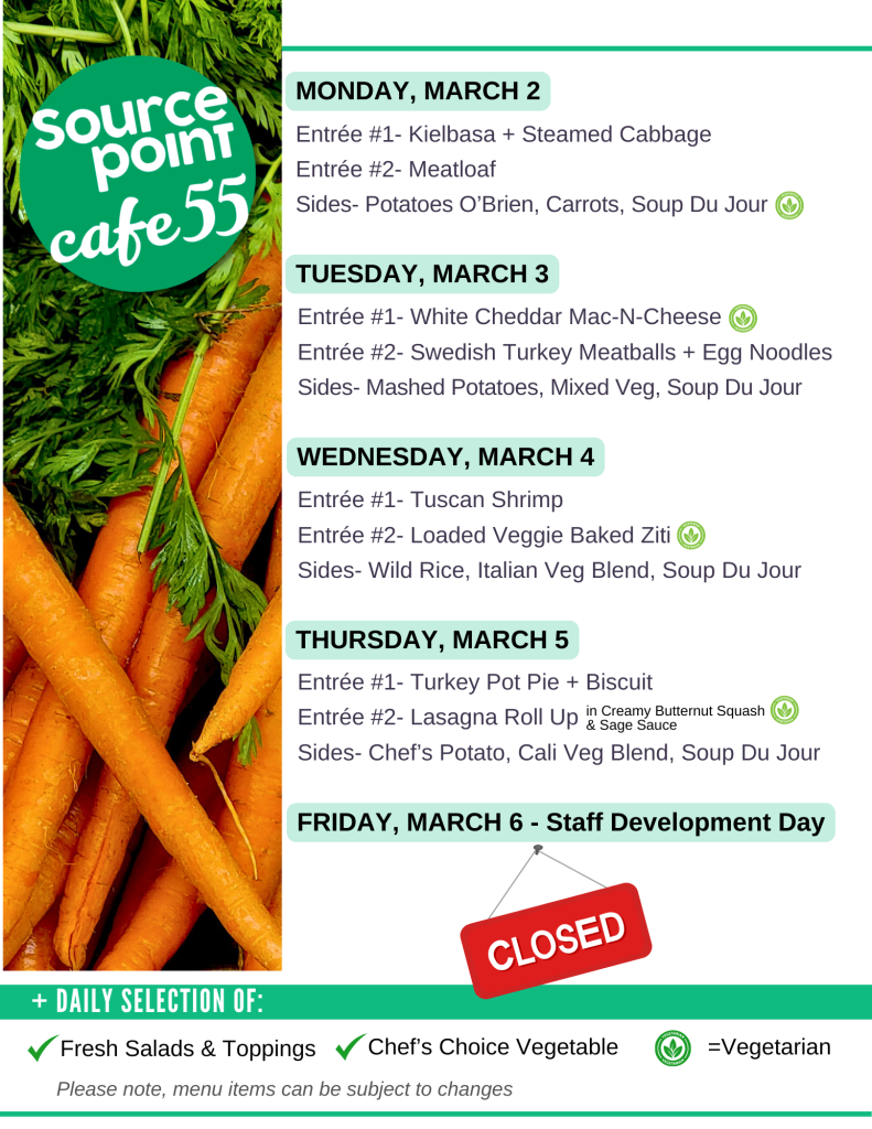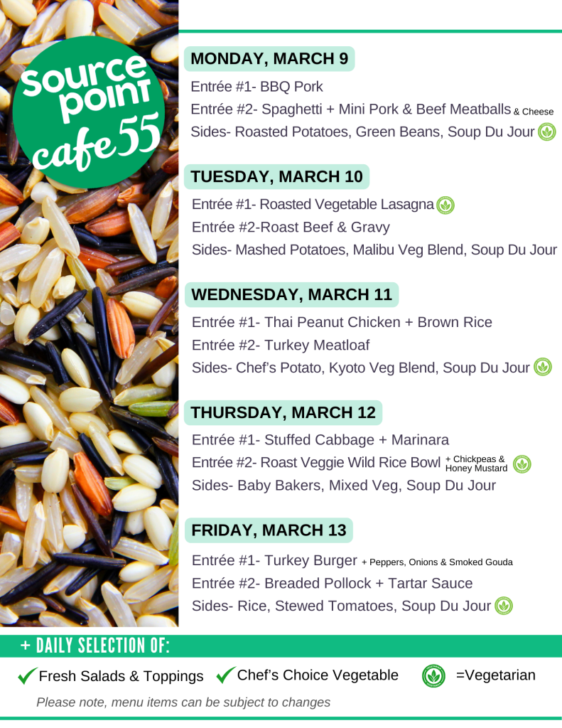 SourcePoint’s Cafe 55 is a place for people ages 55 and older to eat lunch and have fun! Café 55 is open to anyone in the community for lunch (11 a.m. to 1:30 p.m.) For Delaware County residents aged 55+, lunch is available on a donation basis with proper paperwork (suggested donation: $5). Those under the age of 55, or guests of a SourcePoint member, may purchase a lunch for $8.