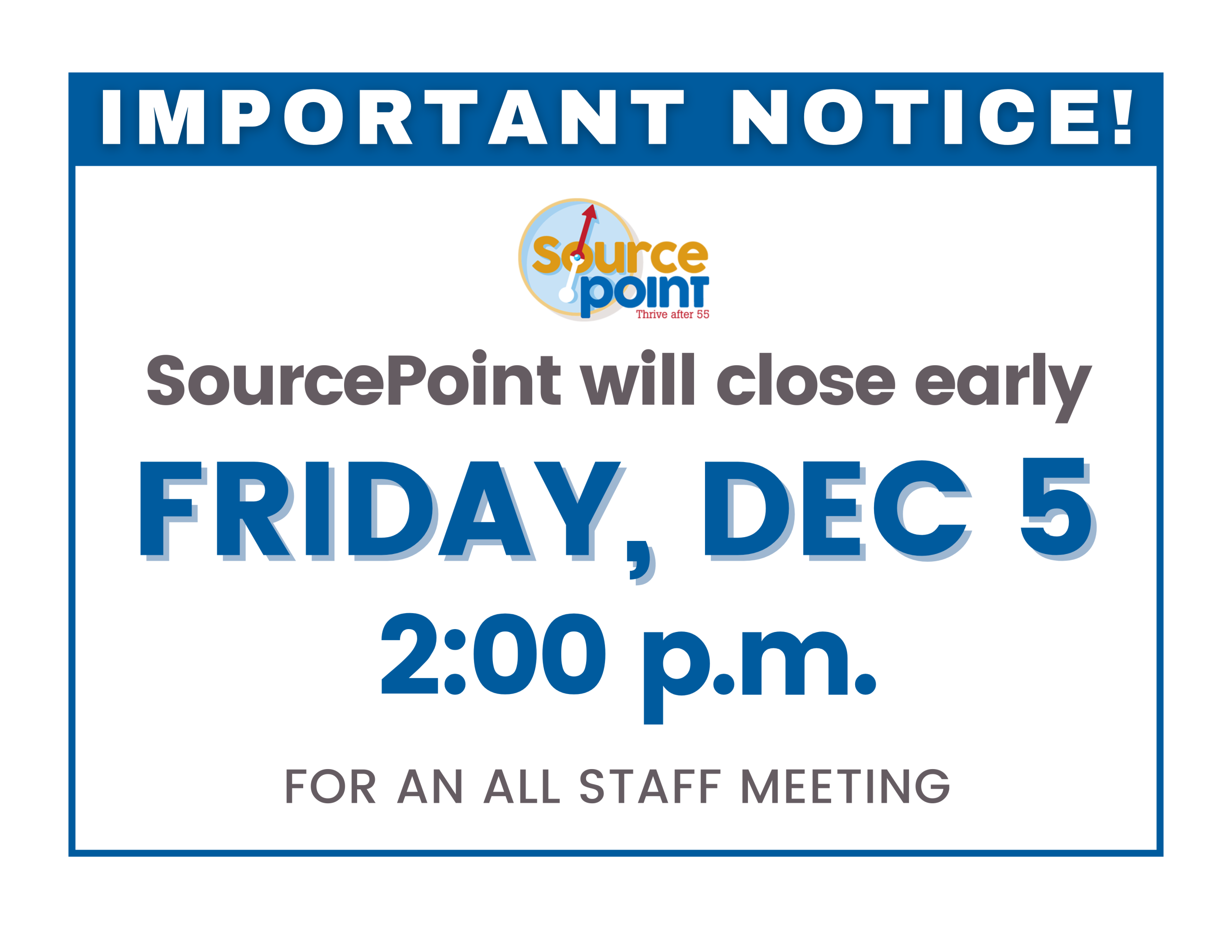 SourcePoint is committed to providing an inviting, safe environment for program participants and the community at large. Staff, volunteers, and board members strive to create programs and activities that provide intellectual stimulation, improve your physical well-being, and allow for social engagement on multiple levels. We recognize that each individual has the freedom of choice with regard to participation and expect all involved to respect the rights of others.