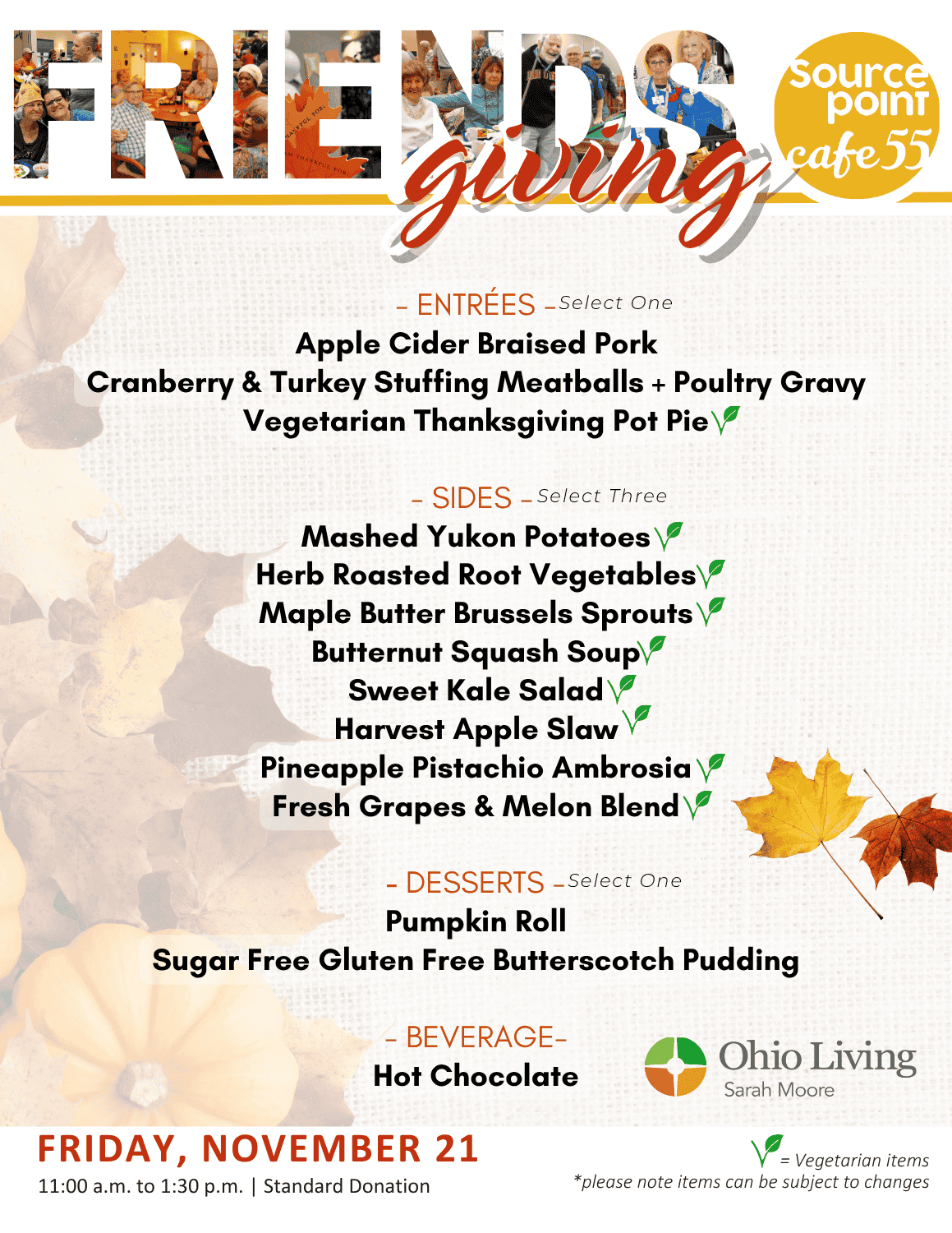 Cafe 55 is open to anyone in the community for lunch (11 a.m. to 1:30 p.m., Monday through Friday). Those under the age of 55, or guests of a SourcePoint member, may purchase a lunch for $8. For Delaware County residents, age 55+, lunch is available on a donation basis (suggested donation of $5).