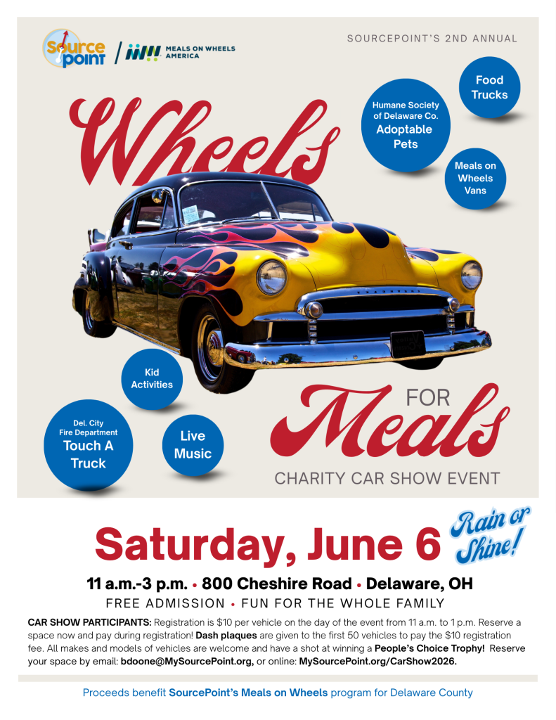 Please join us for the 2nd annual Wheels for Meals charity car show event on Saturday, June 6, 2026, to raise awareness and proceeds for SourcePoint’s Meals on Wheels program.
